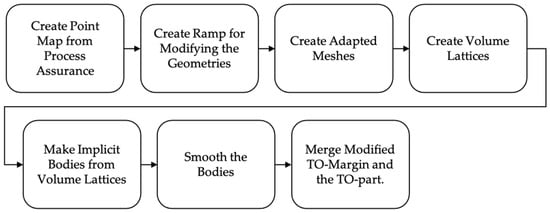 The objective for the final postprocessing is to remove a volume fraction in the amount of from the design space and then add and or remove some additional material from the TO-margin to improve the manufacturability. This is done with nTopology’s implicit modeling technology [34] and the corresponding workflow is illustrated in Figure 7. The implicit modeling technology provides the big advantage that structures are described by equations and not by edges as in the boundary representations. This means that various structures can be merged together easily by using Boolean operators.