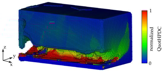 At the beginning, there is a point map, as illustratively shown in Figure 5, with the used evaluation criterion from the process assurance. Here, the criterion QuotHPDC (Figure 8) is applied to modify the high pressure die casting part, respectively, and QuotLPDC modifies the low pressure die casting part. To avoid a falsification in the further post-processing, outliers of the minimum one percent and the maximum one percent of the criterion value are removed. The criteria value of these cells is set to the minimum or maximum of the remaining values of the quality criteria. Afterwards, the quality criteria are rescaled in a range between 0 and 1 following: