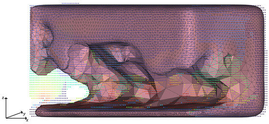 In the next step, the volume mesh is transferred into an implicit body, and the thickness of the mesh is thereby also controlled by the evaluation criterion ramp. To delete undesired elements from the part, which are characterized by thin connections, a smoothing step is applied. In this case, the grid size was 5 mm, and 5 smoothing iterations were conducted. The implicit volume lattice body before smoothing is shown representatively in Figure 10.
