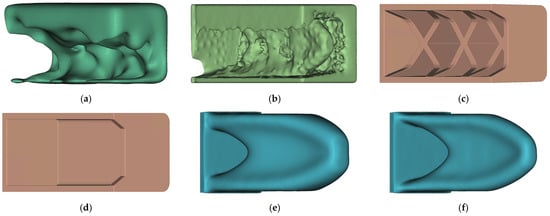 Comparison of all HPDC and TO design proposals: (a) HPDC-IT_6; (b) HPDC-OS; (c) HPDC-50; (d) HPDC-30; (e) TO-50; (f) TO-30.