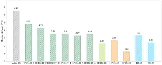 The median decreased continuously for the first five iteration and seemed to find a minimum at HPDC-IT_5. Nevertheless, the HPDC-OS median is significantly lower, which indicates that the HPDC-IT approach is trapped in local minima for the chosen step-length of 0.2. The results of the evaluation of the number of manufacturable elements in Figure 18 further support this assumption.