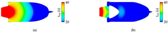 Solidification time for a cross section along the mid-plane. In the geometry LPDC-IT_5, a directed solidification was achieved, whereas for TO-30, a hot spot above the void region could not be fed adequately. (a) LPDC-IT_5; (b) TO-30.