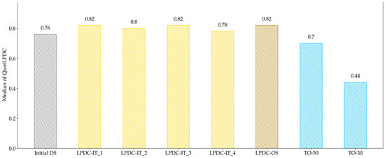 Evaluation of the median of QuotLPDC for all investigated geometries in the LPDC process. The median hardly changes between the design of the iteration and the One-Step result.