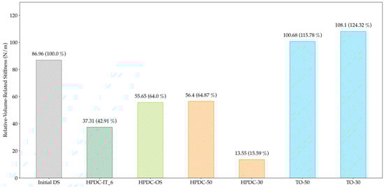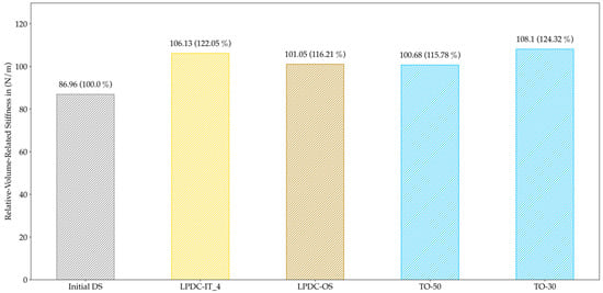 Volume-related stiffness for all LPDC configurations; the deviation to the Initial DS is noted in brackets. Both approaches show similar relative-volume-related stiffness to the TO configurations.