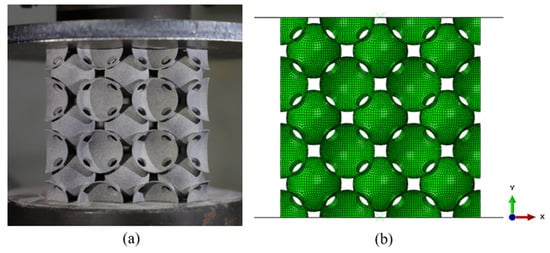 Numerical simulations were performed for the structures under the corresponding experimental conditions using ABAQUS 6.14 finite element software. The geometric models of PHSSs in different arrangements were simulated with automatically generated four-node shell element (S4R) meshes, which significantly reduced the modelling time. An average length of the elements 0.8 mm, approximately 4% of the sphere diameter, was used following a mesh convergence analysis. For the SC, BCC, and FCC PHSSs with 3 × 3 × 3 cells, the FEMs contained 53,352, 96,336, and 189,216 elements, respectively. The FEM of the BCC PHSS is shown in Figure 3 as an example. The bottom plate was subjected to fixed restraints, a vertical downward displacement load was arranged at the top plate, and the contact between the rigid plates and the structure was defined as surface-to-surface contact. The hard contact algorithm was used for normal behaviour, and a friction coefficient of 0.1 was considered for tangential behaviour. In consideration of the self-contact behaviour in the large deformation stage, general contact was used for all structures.