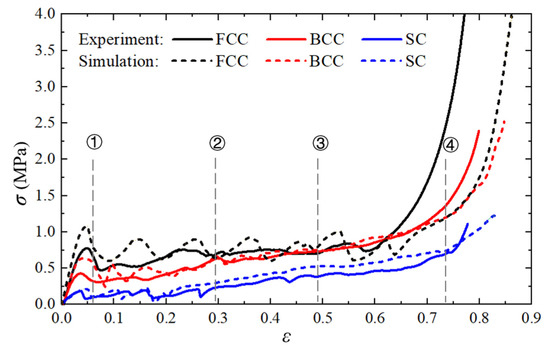 The ABAQUS/Explicit method was then employed to simulate the mechanical behaviour of different structures under quasi-static compression, and a comparison was made between the numerical simulations and the experimental results. For ease of analysis, the nominal stress σ was defined as the plate pressure divided by the projected area of the structure on the plane, and the nominal strain ε was defined as the ratio of the loading displacement to the initial height of the structure. It is necessary to note that all the “stress” and “strain” mentioned in following sections indicate the nominal stress and nominal strain respectively, if not indicated otherwise.
