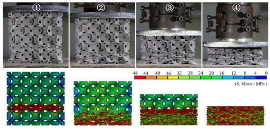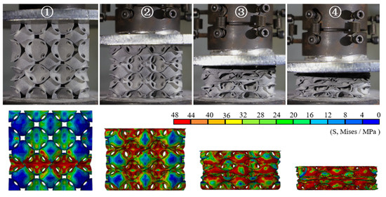 In this study, compression tests were conducted for three groups of structures with different arrangements, and the results of each group reveal favourable consistency. A comparison between the experimental results and the numerical simulation results shows certain differences between the two, mainly because some errors and defects inevitably occurred during 3D printing and post-processing, thereby resulting in changes in the mechanical properties of the structure. The presence of errors and defects is also a common problem to be solved in the engineering application of 3D printing technologies. Overall, the deformation patterns of the PHSSs in different compression stages and the corresponding stress–strain curves were substantially consistent; therefore, the FEM established in this study is reliable.