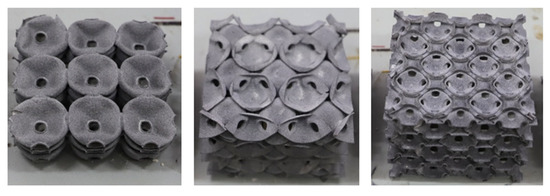 For the traditional soldered or adhesive bonded metallic hollow-sphere structure (Figure 1a), the connection part between two spheres adopts a certain geometry, as shown in Figure 1b. For the PHSSs, the connection cavity shown in Figure 1c was used to link two perforated spheres, and the wall thickness of the connection cavity was identical to that of a hollow sphere; this geometric model can be divided into appropriate shell elements to reduce the simulation time significantly [12]. The main geometric parameters include the hollow sphere radius Rm, wall thickness t, opening or hole diameter dm, and distance d between adjacent hollow spheres. Since the perforations are located between spheres or in connections, for different sphere spatial arrangements, the numbers of openings in a single hollow sphere are different: there are 6, 8 and 12 openings corresponding to 6, 8 and 12 connections for one single hollow sphere in the SC, BCC and FCC packing structures, respectively. Figure 2a–c shows the 3D printed 3 × 3 × 3-cell PHSSs in different arrangements, where Rm = 9.75 mm, d = 20.5 mm, dm = 5.5 mm, and t = 0.5 mm, and the relative density is 0.0654, 0.0833, and 0.0882, respectively. The relative density can be calculated by Equation (1) [25].