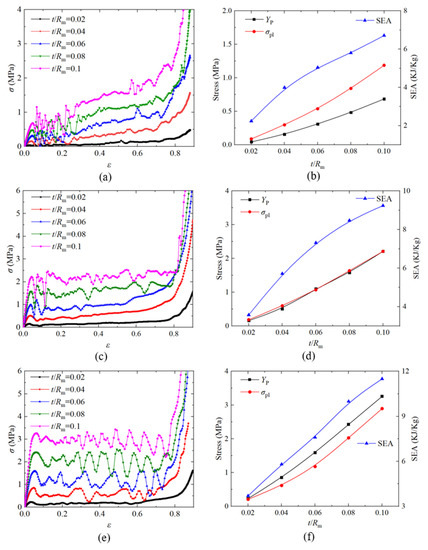 When investigating the influence of wall thickness t, the t value was set as 0.195 mm, 0.39 mm, 0.585 mm, 0.78 mm, and 0.975 mm; the dm value was fixed to 5.5 mm; other parameters were unchanged; and the corresponding t/Rm was 0.02, 0.04, 0.06, 0.08, and 0.1. Figure 9a,c,e shows the nominal stress–strain curves of the SC, BCC, and FCC PHSSs, respectively, with different wall thicknesses under quasi-static compression; Figure 9b,d,f shows the curves describing the variations in first peak stress YP, plateau stress σpl, and SEA with different wall thicknesses for the SC, BCC, and FCC PHSSs, respectively. The results indicate that the YP, σpl and SEA values of the different PHSSs increased as the wall thickness increased, and the differences were as follows: for the SC PHSS, YP was always less than σpl; for the BCC PHSS, YP was essentially equal to σpl; and for the FCC PHSS, YP was always greater than σpl.