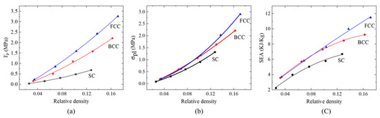 For the comparison of the compressive mechanical properties and energy absorption characteristics of the PHSSs in different arrangements, the numerical simulation results were fitted as a function of the relative density, as shown in Figure 11. The results show that the first peak stress YP and plateau stress σpl of the PHSSs increased as the relative density increased; the lower the relative density was, the closer the results of the different PHSSs were to one another. Overall, with the same relative density, the YP, σpl, and SEA values of the SC PHSS were the lowest, the YP value of the FCC PHSS was the highest, and the values of the BCC PHSS were in between. The possible causes are as follows: the individual hollow sphere inside the SC PHSS was subject to the least constraints; the individual hollow sphere inside the FCC PHSS was under the most constraints; and the constraints of the BCC PHSS were in between. The more constraints a hollow sphere is under, the harder it is to buckle. When the relative density was between 0.02 and 0.1, the σpl and SEA values of the BCC PHSS were extremely close to those of the FCC PHSS. When the relative density exceeded 0.1, the σpl and SEA values of the FCC PHSS progressively exceeded those of the BCC PHSS.