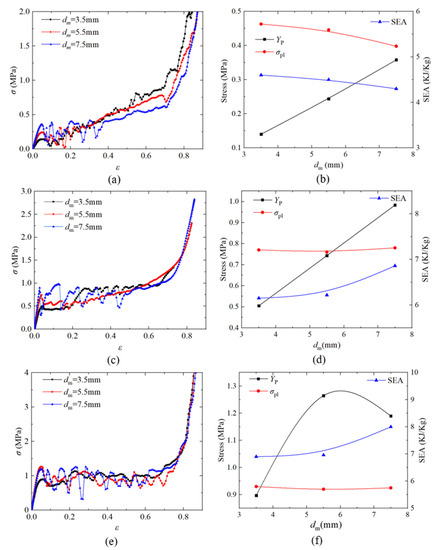 When investigating the effect of hole diameter dm, the dm value was 3.5 mm, 5.5 mm, and 7.5 mm, the t value was fixed to 0.5 mm, and the other parameters were unchanged. Figure 12a,c,e shows the nominal stress–strain curves of the SC, BCC, and FCC PHSSs, respectively, with different hole diameters under quasi-static compression; Figure 12b,d,f show the curves describing the variations in first peak stress YP, plateau stress σpl and SEA with the change in the hole diameter for the SC, BCC, and FCC PHSSs, respectively. The results show that for the SC and BCC PHSSs, the YP value increased as dm increased; i.e., YP was clearly positively correlated with dm, while for the FCC PHSS, when dm increased to a certain value (approximately 6 mm by fitting), YP began to decrease, and the curve reflecting the variation in YP of the FCC PHSS with the change in dm was parabolic, which is probably because the FCC PHSS had the most openings; therefore, the larger dm was, the greater the loss of mass was, and when dm reached approximately 6 mm, the strength began to decrease due to an excessively high mass loss. Similar conclusions have been drawn for the mechanical properties in the elastic stage and the initial yield stage of PHSSs [27]. In addition, the hole diameter had a significant effect on the YP value of PHSSs in different arrangements, but it had a relatively small effect on the σpl and SEA values in the large deformation stage of various PHSSs (due to the average effect in the stress–strain curves). The SEA results show that for the SC PHSS, the SEA value decreased slightly as dm increased, but the energy absorption did not fluctuate significantly. For the BCC and FCC PHSSs, when dm = 7.5 mm, the SEA value was significantly higher than the values of structures with smaller hole diameters (3.5 mm, 5.5 mm). This may be because the BCC and FCC PHSSs had more openings than the SC PHSS; when the dm value was very large, the decrease in the density was greater, and according to Equation (3), the SEA value of the BCC and FCC PHSSs could be higher for large dm values.