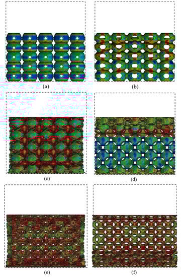 Figure 10 shows the large deformation patterns of the PHSSs in different arrangements, and the dotted box in the figures represents the original structural dimensions. The numerical simulation results also indicate that when the wall was very thin (the t/Rm values were 0.02 and 0.04), the sphere wall near each opening in the PHSS was prone to stress concentration; as the displacement increased, for two adjacent hollow spheres, one could undergo unstable buckling deformation, and the other could collapse into it; and for the different PHSSs, such a local deformation mechanism could cause different changes in the lateral dimensions of the structure. For the SC PHSS, the hollow spheres collapsed into each other in the same direction as the loading, and the hollow spheres squeezed each other vertically, which could increase the lateral size. When the wall was very thin, the lateral dimension did not change significantly; as the t value increased (t/Rm reached 0.06), the deformation mechanism of the mutual depression of the SC PHSS became stable, and the lateral dimension after compression gradually increased as t increased (Figure 10a,b). For the BCC and FCC PHSSs, when the wall thickness t was very small, under axial compression, the local buckling/depression due to the mutual extrusion of the hollow spheres caused the transverse contraction of the entire structure (t/Rm was 0.02; Figure 10c,e); as t gradually increased, the stress concentration and local buckling/depression of the sphere wall around the opening decreased; and when the wall was thick, the layer-by-layer bending deformation of the spherical wall dominated, while the transverse contraction of the overall structure gradually disappeared (t/Rm was 0.1; Figure 10d,f).