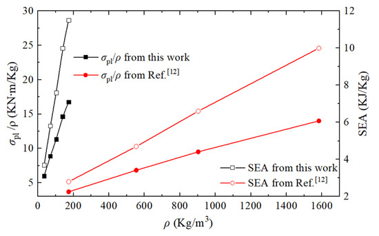The specific strength (plateau stress/density, σpl/ρ) and energy absorption characteristics (SEA) of PHSS are compared with those of the traditional MHSS made of mild steel, as shown in Figure 14. The material is defined to be elastoplastic with a Young’s modulus of 200 GPa and a yield stress of 200 MPa. The density ρ of the porous structure or material is the product of the relative density and solid material density. This comparison focuses on the results from FCC structures with different wall thicknesses according to Reference [12]. The presented 3D-printed PHSS has a lower density ranging from 34–174 kg/m3, and the traditional MHSS has a higher density ranging from 173 to 1600 kg/m3, while the specific strength and SEA capacities of the 3D-printed PHSS are higher than those of the traditional MHSS. The reason can be attributed to two aspects: using lightweight solid material with good mechanical properties and perforating appropriately in hollow sphere structures for further dead weight reduction.