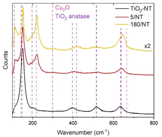 Figure 2 shows Raman spectra of TiO2 nanotubes and selected TiO2-NT@Cu2O heterostructures. The spectrum of titanium dioxide nanotubes displays five Raman modes: 150, 203, 395, 516, and 635 cm−1. All of them can be assigned to the TiO2 anatase polymorph [34]. After the electrodeposition of Cu2O, as expected, the modes arising from TiO2 are widened due to partial overlap with new modes derived from copper(I) oxide. What is more, as the prolongation of the electrodeposition time from 5 to 180 s results in a complete coverage of the surface of nanotubes by Cu2O (see Figure 1), Cu2O Raman modes in the spectrum become better pronounced.