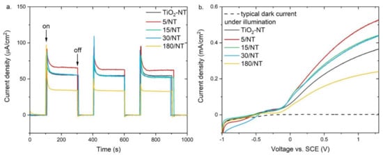 Photoelectrochemical characteristics of TiO2-NT and TiO2-NT@Cu2O anodes: (a) current-time and (b) current-voltage curves.