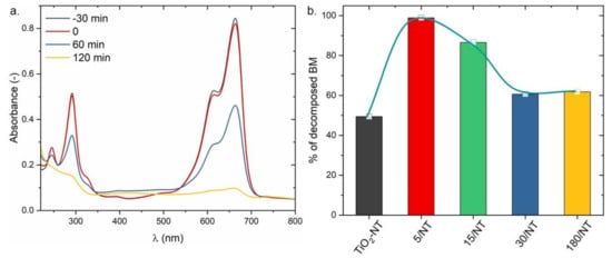TiO2-NT@Cu2O heterostructures were also tested in the process of photoelectrocatalysis. The choice of organic dyes is very wide. From among them, methylene blue (MB) belongs to the group of cationic dyes. It is introduced into nature as a water pollutant from the textile industry and is highly toxic and carcinogenic. It is also a model pollutant in the study of photocatalytic activity of semiconductors [35]. That is why the ability of the photoanodes to degrade pollutants was evaluated against MB under sunlight simulated by an Xe bulb and applied a potential difference equal to 1V. Typical spectral dependences of MB absorbance obtained before and during photoelectrocatalytic decomposition are presented in Figure 4a. The time required to establish the adsorption-desorption balance of methylene blue was 30 min. Since the presence of leuco methylene blue was excluded (please refer to Supplementary Materials, Figure S2), the decrease in absorbance can be directly correlated with the decreasing concentration of the partially decomposed dye. Figure 4b shows the percentage of decomposed MB after 60 min of the process for TiO2 nanotubes and heterostructures. It is worth noting that all heterostructures show greater activity towards methylene blue decomposition than TiO2-NT, even though it removes 49% of MB. The results obtained for TiO2-NT@Cu2O heterostructures prepared in the electrodeposition process lasting for 5, 15, 30, and 180 s are 99%, 86%, 61%, and 62%, respectively. These results correlate well with the results of photoelectrochemical measurements (see Figure 3b).
