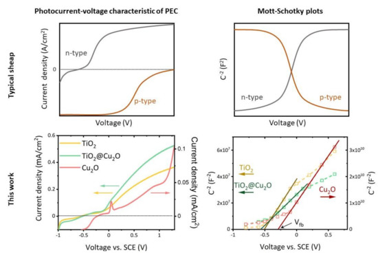 The type of heterojunction is closely related to the type of semiconductor, i.e., p-type or n-type, band-gap energy and band edges position. The n- and p-type conductivity of the photoelectrode based on titanium dioxide nanotubes TiO2-NT and copper(I) oxide Cu2O were determined on the basis of the analysis of the photocurrent under illumination with white light as a function of the applied bias voltage (VB) and Mott–Schottky (M–S) plots. Figure 7 illustrates the methods of analysis of the experimental data for a hypothetical photoanode (n-type) and photocathode (p-type), and the results obtained for the photoelectrodes studied in this work. The M–S plot will possess a negative slope for p-type materials and a positive slope for n-type materials.