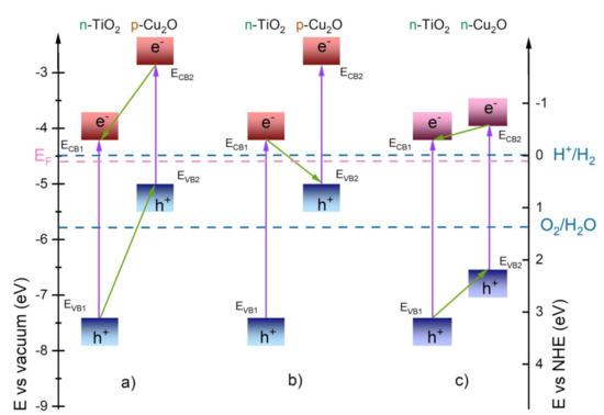 The current–voltage characteristics of the photoelectrochemical cell with TiO2@Cu2O photoanode show an increase in photocurrent and solar-to-chemical energy conversion efficiency in relation to the TiO2 anode. Similarly, the photoelectrocatalytic degradation of MB reveals an increase in the activity of heterostructures compared to TiO2. The nature of Cu2O conductivity in the vast majority identified as p-type indicates a possibility of creating a TiO2@Cu2O p-n system of either type II junction (Figure 8a) or a Z-scheme (Figure 8b). Both configurations of the p-n type TiO2@Cu2O heterostructure can be considered when the system acts as a photocatalyst. Aguirre et al. [42] indicated that the TiO2@Cu2O system plays not only the role of a photocatalyst in the CO2 reduction reaction, but also prevents Cu2O from photocorrosion if the heterostructure acts as a Z-scheme. In this case, the electron holes from the Cu2O valence band in the aftermath of recombination with electrons from the TiO2 conduction band cannot participate in the process of Cu2O photocorrosion. The photoanode based on TiO2 modified with copper(I) oxide in a photoelectrochemical cell requires a directed flow of electrons from the anode to the cathode, which means that processes occurring according to the Z-scheme can be difficult. As mentioned before, n-type conductivity of Cu2O in the form of layers obtained by the electrodeposition is well known in the literature [43,44]. In this work, n-type conductivity both for Cu2O and TiO2@Cu2O was proved based on both PEC current–voltage characteristics and Mott–Schottky plots. Additionally, taking into account the fact that the flat band potential can be practically identified as the edge of the conduction band, the value of the flat band potential obtained from the M–S plot and Iph–V measurements makes it possible to determine the bottom of the conduction band. Flat band potential Vfb for Cu2O is equal to −0.29 V, whereas for TiO2 nanotubes and TiO2@Cu2O it is comparable and equal to −0.50 and −0.56 V, respectively.