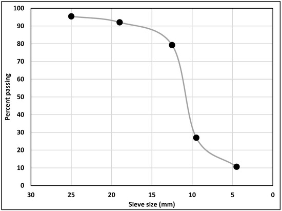 Type I/II—Ordinary Portland Cement (OPC) with Blaine fineness of 390 m2/kg and type IL—Portland Limestone Cement (PLC) with Blaine fineness of 450 m2/kg were used as binders. Type IL PLC was produced by inter-grinding type I cement clinker with 15% of limestone in the cement plant. Table 1 shows the chemical composition of OPC (Lafarge, Ravena, NY, USA), PLC (Capitol Aggregates Inc., Austin, TX, USA), Class F fly ash (Boral Material Technologies, San Antonio, TX, USA), and Class C fly ash (Lubbock, TX, USA). Limestone with a nominal maximum aggregate size of 19 mm (0.75 in) and siliceous sand with a fineness modulus of 2.6 were used as coarse and fine aggregates (locally available), respectively. The gradation of coarse aggregate is shown in Figure 1. We used 98% pure white precipitated nano calcium carbonate (CaCO3) with an average diameter of 40 nm and surface area greater than 40 m2/g.