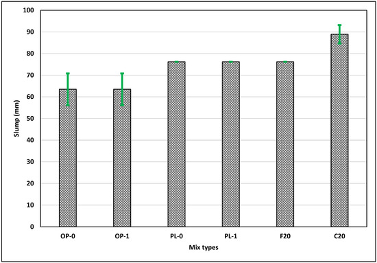 Figure 2 shows the slump for different concrete mixes. The slumps for both class F and C fly ash concretes are relatively higher as compared to those for OPC concrete. Class C fly ash concrete has approximately 50% higher slump than the OPC; this difference can be attributed to the morphologic effect, resulting from the micro beads present in the fly ash acting as a lubricating agent in fresh concrete [39]. However, the PLC concrete had comparable slump values to those of fly ash concretes. It was also observed that the replacement of 1% nano CaCO3 had minimal effects on the slump for OPC and PLC concretes. Although the water demand is expected to increase with the use of finer particles, lower replacement levels did not seem to affect the workability [24].