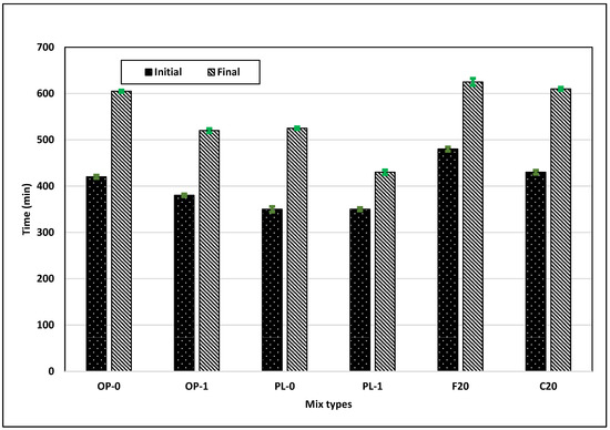 As we replaced the cementitious materials with pozzolans such as fly ash, the pozzolans reacted with calcium hydroxide, a product of cement hydration, thus inhibiting early hydration. This had a pronounced effect on the set time of the concrete, as illustrated in Figure 3, with fly ash concretes displaying a larger set time compared to OPC and PLC concretes. Further, Class C fly ash concrete showed a lower set time compared to Class F fly ash concrete due to a higher amount of calcium oxide content in Class C fly ash.