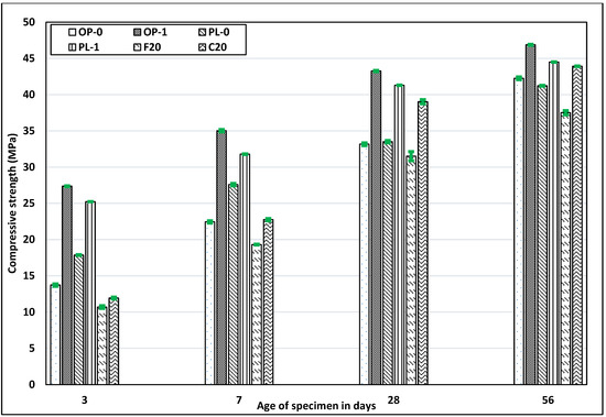The strength of concrete mainly depends on the amount of hydration products, the porosity of concrete, and the packing of the microstructure. Figure 4 illustrates the compressive strength achieved for all the concretes. In general, fly ash concretes have lower early strength compared to OPC and PLC. As shown in Figure 4, Class F fly ash concrete showed the lowest strength among all concrete types at 3 days and 7 days. Similar results were observed for testing at 28 days and 56 days, while studies have shown that the Class F fly ash concrete strength normally exceeds the OPC concrete strength at about 90 days [39,40]. It should also be noted that the pozzolanic reaction takes place even after years of concrete placement. On the other hand, the strength of Class C fly ash was comparable to that of OPC at 28 days and exceeded the corresponding values for OPC and PLC at 56 days.