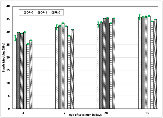 The elastic modulus of concrete mainly depends upon the aggregate properties and porosity or densification of the paste. Since the same aggregate was used in all concrete types, no significant difference was observed. However, there seemed to be loose correlation between compressive strength and elastic modulus due to the denseness of the hydrated cement paste. Figure 5 shows the elastic modulus of all concretes. At all ages, fly ash concretes (especially Class F) displayed a relatively lower modulus value as compared to OPC and PLC concretes. In contrast to the reduced modulus of concrete with fly ash, nano CaCO3 improved the modulus values for both OPC and PLC. Nano CaCO3 did not compromise the development of concrete stiffness, in contrast to as fly ash, and could serve as a better alternative to fly ash.