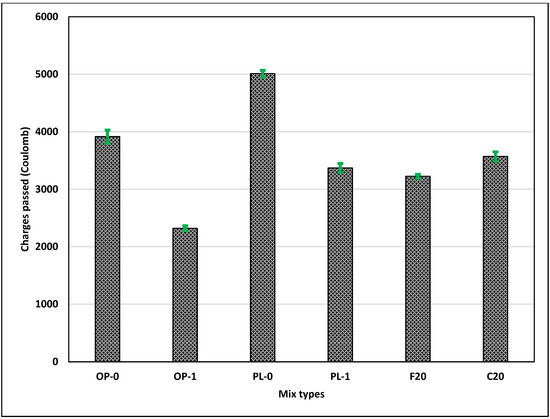 The RCPT measures concrete resistivity, not permeability; however, it has been shown that a correlation exists between concrete resistivity and permeability [41]. Figure 6 shows the charges passed in coulombs for all the concretes. It can be observed that the concretes with fly ash showed lower charges passed compared to OPC and PLC. The lower charges observed in fly ash concrete can be attributed to the formation of more CSH gel due to the pozzolanic reaction at later ages and increased density of the concrete. Class F fly ash concrete showed a lower value than Class C, as the amount of silica present in Class F was higher, leading to increased pozzolanic reaction in concrete.
