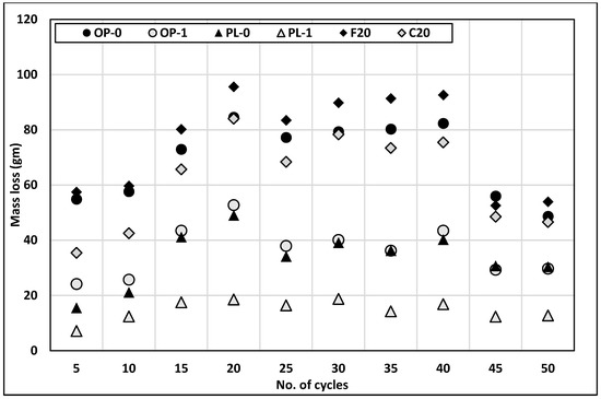 Figure 7 presents the results for scaling resistance of concretes, where mass loss after every five cycles of freezing and thawing can be observed. For all concrete types, the rate of mass loss gradually increased in early cycles, followed by steady and decreased mass loss at later cycles. Class F fly ash concrete was observed to have the highest mass loss, followed by OPC and Class C fly ash. PLC experienced the least mass loss. Several factors, including porosity or strength, w/b ratio, method of curing, air entrainment, and type of coarse aggregates used, affect the scaling resistance of concrete [43,44]. Among these factors, air entrainment and porosity are considered the two major critical factors. In this test, concrete was mixed without the use of any air-entraining admixtures.