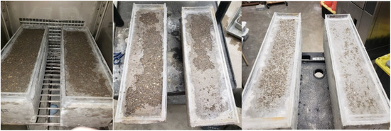 Figure 8 shows the concrete surface of all samples after 20 freeze-and-thaw cycles with a calcium chloride solution. The fly ash concrete had maximum scaling, as seen in Figure 8, as all of the top layers were scaled off. The organic matter and carbon content present in fly ash reduced the effects of the retainment of air pockets, thus reducing the scaling resistance [46]. Also, a lower strength of fly ash at the early ages has been considered as another factor for increased mass loss in fly ash concrete [46]. This phenomenon can also be observed in the differences between mass losses in Class C and Class F fly ash concretes. Class C fly ash concrete showed relatively higher early strength than Class F fly ash; therefore, it had a smaller mass loss compared to Class F fly ash. It should also be noted that ASTM C672 is considered a very harsh laboratory testing and does not replicate the actual field condition. Case studies have shown that adequate air entrainment with lower fly ash content seems to have performed satisfactorily in the field [47].
