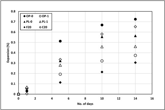 The alkali–silica reaction (ASR) in concrete occurs when reactive silica present in the aggregates react with hydroxide ions in pore solution to form expansive silica gel, which could cause micro cracks in concrete when moisture is absorbed. The expansion of concrete due to ASR depends on several factors such as alkali content of the cement, amount and reactivity of silica present in aggregates, availability of moisture, and porosity of the concrete. Figure 9 presents the testing results from ASTM C1260. The fine aggregate selected in this evaluation is known for excessive ASR potential.