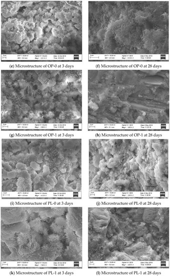 SEM images of cement pastes were analyzed for further research. In Figure 10, the images on the left column (Figure 10a,c,e,g,i,k) correspond to 3-day hydration for F20, C20, OP-0, OP-1, PL-0, and PL-1, respectively, and the figures on the right column (Figure 10b,d,f,h,j,l) correspond to 28-day hydration. The 3-day hydration images for all cement paste show a fluffy structure with ettringite crystals, indicating early hydration. Similarly, the 28-day images for all samples show hardened CSH gel, portlandite crystals, and ettringite needles.