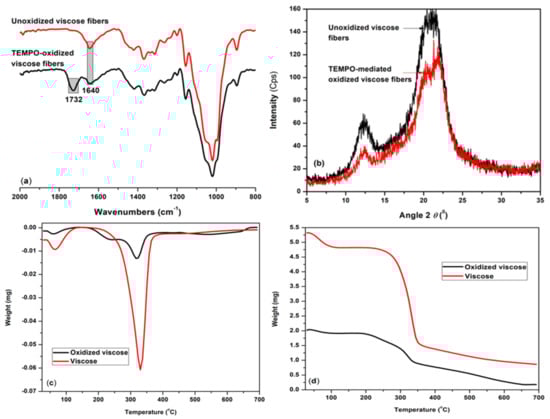 Infrared spectroscopy can be used as a powerful technique to check the successful conversion of the OH groups into COOH groups during cellulose oxidation [85,86]. The TEMPO-mediated oxidation of viscose fibers allows the formation of significant amounts of 6-carboxy cellulose, with increasing amount from 6 mmol/kg in the unoxidized sample to 280 mmol/kg in the oxidized sample, as determined by using potentiometric titration [81,87]. The main adsorption bands related to hydrogen bond stretching vibration of the OH groups at 3345 cm−1 and to stretching vibrations of CH at 2905 cm−1 are nearly unchanged after oxidation. Figure 1a indicates the fragments of the FTIR spectra of the most visible transformations. These are mostly related with the apparition of a characteristic adsorption for carboxylate groups at 1732 cm−1 assigned with COO− groups in their acidic forms [85,86]. The crystallinity pattern of the oxidized sample does not essentially differ from that of the pristine viscose, suggesting that the oxidation treatment did not affect the crystalline structure of the cellulose, Figure 1b. The measured crystallinity increased after oxidation from about 25% in the original sample to about 28%, this increase in the crystallinity might be due to removal of small amorphous fragments, as water soluble by-product, favored by the alkaline media.