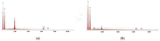 SEM pictures (Figure 3), reveal the main changes that occurred in the morphology of the viscose fibers. The fibrillar structure of the viscose fibers is maintained after the TEMPO-mediated oxidation, which proved the “surface” character of the protocol, Figure 3a,b. On the other hands, the presence of some micro-granules fixed onto the surface of viscose fibers after extractant and Fe ions incorporation can be observed, Figure 3c,d. The presence of such micro-granules can be attributed to the successful immobilization of the phosphorous groups and Fe atoms on the fibers surface, as a consequence of material functionalization.