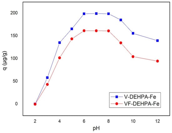 Effect of pH on the adsorption capacity of As(V) on V-DEHPA-Fe and VF-DEHPA-Fe materials, at an initial concentration of As(V) C0 = 1 mg/L at contact time of 60 min and temperature of 298 K was evaluated (Figure 5). The studies were carried out in the pH range of 2–12. From the performance results it can be inferred that for both adsorbent materials, viz. V-DEHPA-Fe and VF-DEHPA-Fe, the adsorption capacity increases with the increase in pH up to 6.0 and beyond 8.0 the adsorption capacity was observed to decrease indicating optimum pH in the range of 6.0–8.0.
