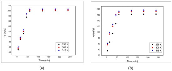 The effect of contact time on the adsorption of As(V) onto V-DEHPA-Fe and VF-DEHPA-Fe materials at three different operating temperatures is presented in Figure 6a,b, indicating that for both materials the process takes place in three steps. In the first step, up to 60 min contact time, adsorption capacity sharply increased due to a very fast As(V) uptake. This step is attributed to bulk diffusion in which the most readily available adsorbing sites on the adsorbent surface are used very fast for both the adsorbent materials used. In the second step, up to 120 min for both materials (V-DEHPA-Fe and VF-DEHPA-Fe) uptake gradually decreased with time until it reached equilibrium. This transition phase is attributed to intra-particle diffusion, meaning the diffusion of adsorbate from the superficial film into the macro-pores of the adsorbent. The third step represents the equilibrium stage in which the removal of the adsorbate becomes almost insignificant, due to the exhaustion of adsorption active sites. For equilibrium studies, a contact time of 120 min was chosen for both materials. Additionally, the adsorption capacity of As(V) slightly increased with temperature increased from 298 to 318 K, indicating that the temperature has a little influence on the adsorption of As(V) onto the adsorbent materials used.