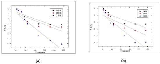 Based on the experimental data obtained, the value of activation energy for V-DEHPA-Fe was found to be 10.74 kJ mol−1 with a coefficient of determination of R2 = 0.9967. Similarly, for VF-DEHPA-Fe activation energy of 30.53 kJ mol−1 and coefficient of determination of R2 = 0.8424 suggest that the adsorption process of As(V) on the materials evaluated is a chemical adsorption, because the activation energy has value higher than 8 kJ mol−1 [93,94]. Thermodynamic studies were conducted in the temperature range 298 to 318 K. These studies provide information about the energy changes associated with the adsorption process, confirming if the process is spontaneous or not. Specific thermodynamic parameters free energy (ΔG0), free enthalpy (ΔH0) and free entropy (ΔS0) were calculated by using relations as provided in Equation (9) through (11).