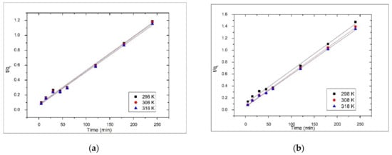 where, k2 is the pseudo-second-order rate constant (min−1 (µg/g)−1). The linearized form of the Equation (7) could be expressed as Equation (8).