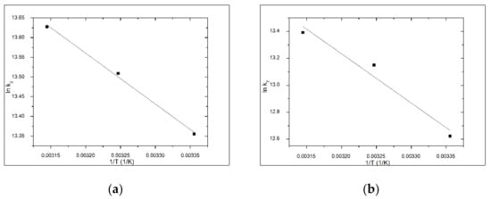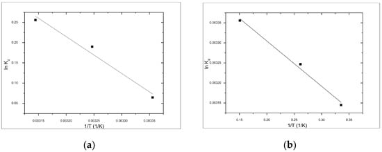 Arrhenius plot of the adsorption of As(V) onto functionalized materials (a) V-DEHPA-Fe and (b) VF-DEHPA-Fe.