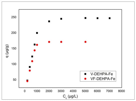 Figure 11 presents the effect of initial As(V) concentration on the adsorption process. From the image depicted in Figure 11 it can be observed that the adsorption capacity increases with increasing of the initial concentration of As(V) for both materials until it reaches a constant value, known as the equilibrium concentration. The maximum adsorption capacity represents an important parameter for designing an adsorption system. Thus, the maximum adsorption capacity of the material V-DEHPA-Fe was 247.5 µg As(V)/g for an initial As(V) concentration of 5 mg As(V)/L and for the material VF-DEHPA-Fe it was 171.2 µg As(V)/g for an initial As(V) concentration of 5 mg As(V)/L.