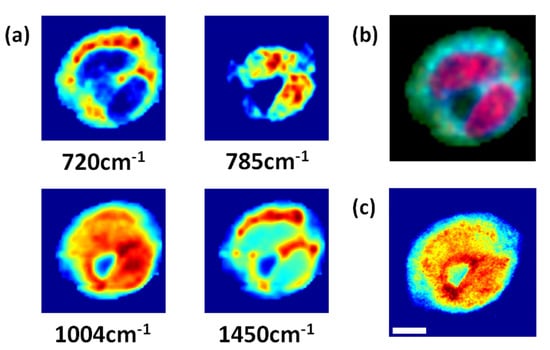 The live HeLa cell was imaged and analyzed using single peak analysis. Raman images were reconstructed from different Raman bands between 613 cm−1 and 1825 cm−1 (Figure 2a). Images reconstructed from single Raman bands with 15 cm−1 bandwidth reveal high-resolution images and biochemical maps. Specifically, the 720 cm−1, 785 cm−1, 1004 cm−1, and 1450 cm−1 peaks correlate to the cytoplasm, DNA, protein and lipid distributions, respectively [15]. This information is well correlated to the bright-field image in Figure 2c. Since the protein signal is uniformly spread over the entire cell volume, this signal was excluded and a pseudo-color image was generated from three other Raman bands corresponding to the cytoplasm, DNA, and lipid Raman signals. In Figure 2e, the red color represents 785 cm−1 (DNA) and is localized to the cell nucleus. Green and blue represents 720 cm−1 (cytoplasm) and 1450 cm−1 (lipids), respectively. Although Raman imaging cannot compete with the imaging speed and resolution of fluorescence imaging, Raman imaging can be performed without any staining, sample preparation, or external perturbation to the cell. In summary, Raman imaging and mapping can simultaneously track multiple chemical components of the live cell in vitro.