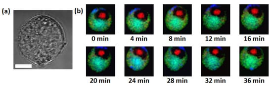 (a) Bright field image of live RKO cell used in the experiment. (Scale bar: 10 µm) (b) Temporal Raman images of live RKO cell (40 × 40 pixels) with four-minute temporal resolution. Red, green, and blue represent 785 cm−1, 720 cm−1, and 1450 cm−1 Raman bands, respectively.