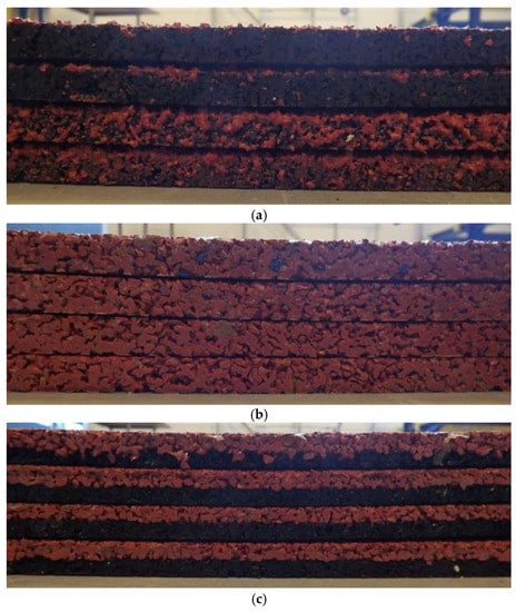 Digital images of the cross-section of the sports surfaces slabs prepared for the tests: (a) SBR covered with a thin EPDM spray layer on the top, (b) clean EPDM, (c) bottom SBR layer with the top layer of EPDM.