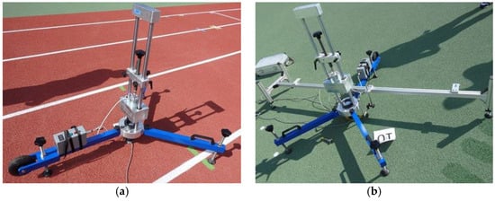 The shock absorption and the vertical deformation tests were carried out in laboratory conditions according to EN 14808:2006 [] and EN 14809:2005 [], respectively. Both tests were conducted at three measuring points for each sample, and a device called an artificial athlete (Elektromechanika Marcin Sienicki, Warsaw, Poland) was used to perform them; see Figure 2. The shock absorption was expressed as the percentage reduction in force that a sports surface exerts compared to a hard concrete surface after the fall of device’s foot. Furthermore, the vertical deformation was described as the level of vertical displacement of the sports surface measured by a sensor (HBM, Poznan, Poland). The purpose of the tests was to determine the level of deflection and shock absorption of the sports surface as a result of running and jumping by the user, i.e., to express the degree to which the surface is set in motion during an impact.