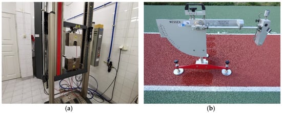 - European Committee for Standardization. EN 14809:2005—Surfaces for Sports Areas—Determination of Vertical Deformation; European Committee for Standardization: Brussels, Belgium, 2005. [Google Scholar]