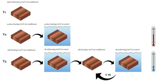 The scheme of thermal interactions preceding the tensile strength and the abrasion resistance tests: T1—conditioning in laboratory at 22 °C temperature for 24 h, T2—cycle of high temperature interaction, T3—cycle of freeze-thaw stresses.