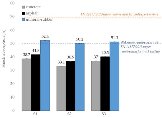Table 2 shows the shock absorption test results that are in the range of 33.1–52.4%. Similar range of shock absorption was reported by Khal and Lee [] as they tested 24 different types of sport surfaces. Presented by them, test results were between 35% and 48%. The highest shock absorptions in our own study were reported for the SBR covered with a thin EPDM spray layer on the top surface, and the lowest shock absorptions were reported for the clean EPDM surface. In addition, the overall maintained trend for each sports surface was reported, regardless of its component materials and their proportions, as on a concrete substrate, the sports surfaces obtained the lowest shock absorption values. Compared to this type of substrate, the shock absorption values increased by about 3–4% and about 14–17% for the asphalt and mineral-rubber substrate, respectively, in every tested type of surface. On the basis of the conducted research, it was found that the mineral-rubber substrate allows for the greatest flexibility of the surface; thus, it is the most comfortable and safe to use. The high flexibility of the combined substrate and surface results in less stress on the joints and a lower risk of athletes’ injury after the fall.