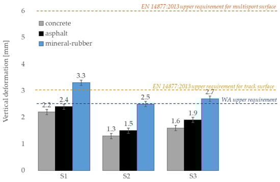 The vertical deformation of tested surfaces is presented in Table 2 depending on the substrate used under them. The highest deformation was reported for SBR covered with a thin EPDM spray layer on the top surface with the mineral-rubber substrate (3.3 mm) and the lowest deformation was reported for clean EPDM surface with the concrete substrate (1.3 mm). This shows a correlation between vertical deformation and shock absorption as the value distribution of both tests is identical. Furthermore, an increase in deformation was noted with the increase in flexibility of substrate used under surface. Compared to surfaces on top of the concrete substrate, surfaces on top of the asphalt and mineral-rubber substrates showed a higher vertical deformation of about 0.2–0.3 mm and 1.1–1.2, respectively. A similar conclusion was made by Yukawa et al. [], who reported that the flexibility of the surface depends not only on the material but also on the substrate under it. In addition, athletes increase their leg stiffness (the stiffness of the integrated musculoskeletal system that behaves as a single linear spring during locomotion) when they are running on a compliant ground compared with running on a hard one, as Katkat [] mentions. That is why surface should be tested taking into account the substrate beneath it, as well. Furthermore, from the point of view of the results achieved by competitive athletes, the most advantageous are surfaces installed on rigid substructures, i.e., concrete and asphalt. They allow obtaining better results than on elastic substrates made of mineral rubber materials. Therefore, according to the WA’s recommendations, track and runways should be installed on rigid substrates (Figure 8).