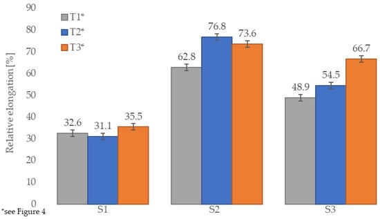 Relative elongation of samples depending on the thermal interaction preceding tensile strength test.