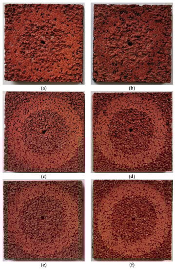 View of the samples after the abrasion resistance test: SBR covered with a thin EPDM spray layer on the top (a) conditioned at 22 °C temperature, (b) after the freeze-thaw stresses; clean EPDM (c) conditioned at 22 °C temperature, (d) after the freeze-thaw stresses; bottom SBR layer with the top layer of EPDM (e) conditioned at 22 °C temperature, (f) after the freeze-thaw stresses.